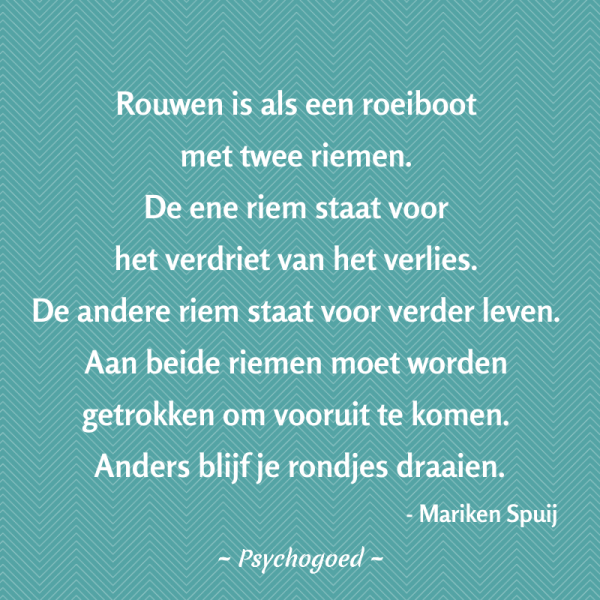Rouwen is verdriet doorleven bij het afscheid nemen van een dierbaar iemand of een dierbaar iets. Het is het proces van omgaan met verlies. Verlies kan zijn bijvoorbeeld verlies van je werk, gezondheid, levensfase, een echtscheiding, het overlijden van een dierbare. Kortom alles wat je dierbaar is en wat je kunt verliezen, brengt een rouwproces op gang. Rouw voelt voor iedereen anders. Iedereen rouwt anders. Hoe je ook met een verlies omgaat; rouwen hoef je niet alleen te doen. Het kan helpen om erover te praten. Steeds opnieuw vertellen. Het overlijden van een dierbare kan maken dat je leven op zijn kop komt te staan. Er is een dierbaar iemand weggevallen die van grote betekenis is voor jou. De dood van iemand die je lief is raakt je en verandert je. Je moet op zoek naar je "nieuwe ik". Op de vele vragen en onzekerheden zijn vaak geen antwoorden. Rouwen is een zoektocht in een chaos in wat er in- en om je heen gebeurt. Het is met vallen en opstaan proberen weer grip te krijgen op alles wat wankel is. Rouwen is hard werken (rouwarbeid) om te leren omgaan met alle bijbehorende emoties en veranderingen. Een nieuw evenwicht zoeken in het leven kost veel energie en vraagt tijd ruimte en aandacht.